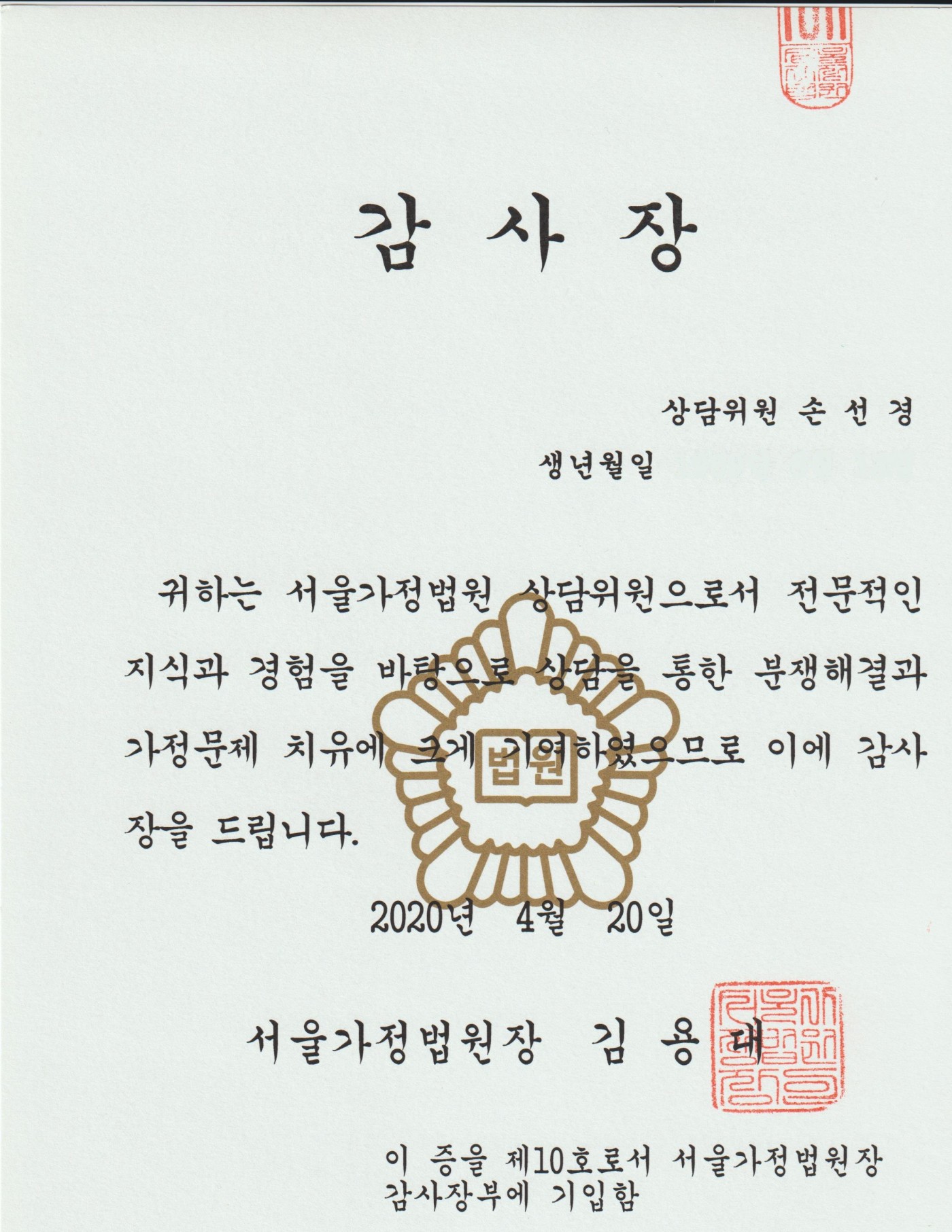저희 마음행복심리상담센터 손선경 소장님께서 서울가정법원장으로부터 감사장을 받으셨습니다.